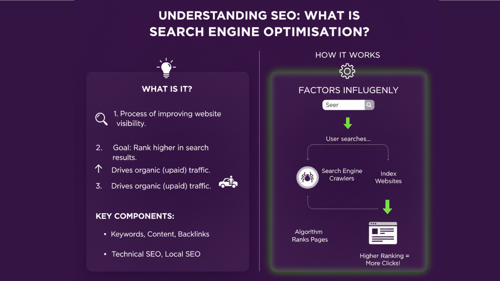 Before we talk about SEO costs, you need to understand what you're actually buying. Search Engine Optimisation is how businesses get found when people search Google, Bing, and other search engines. When someone types "best coffee shop near me" or "accounting software for small business," SEO strategies determine which websites show up first.