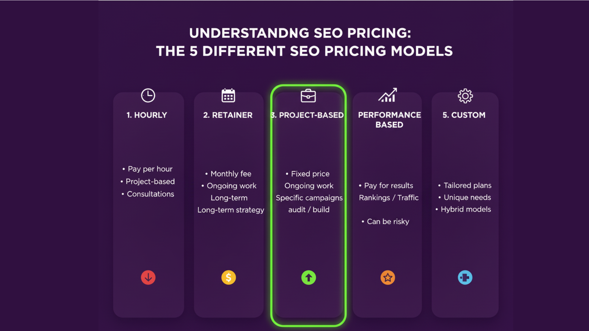 Most SEO agencies use one of five pricing models. Understanding these different SEO pricing structures helps you figure out the right SEO pricing for your business when investing in SEO services. Let's look at these three main pricing models plus two additional options that cover how SEO agencies charge for their SEO work.