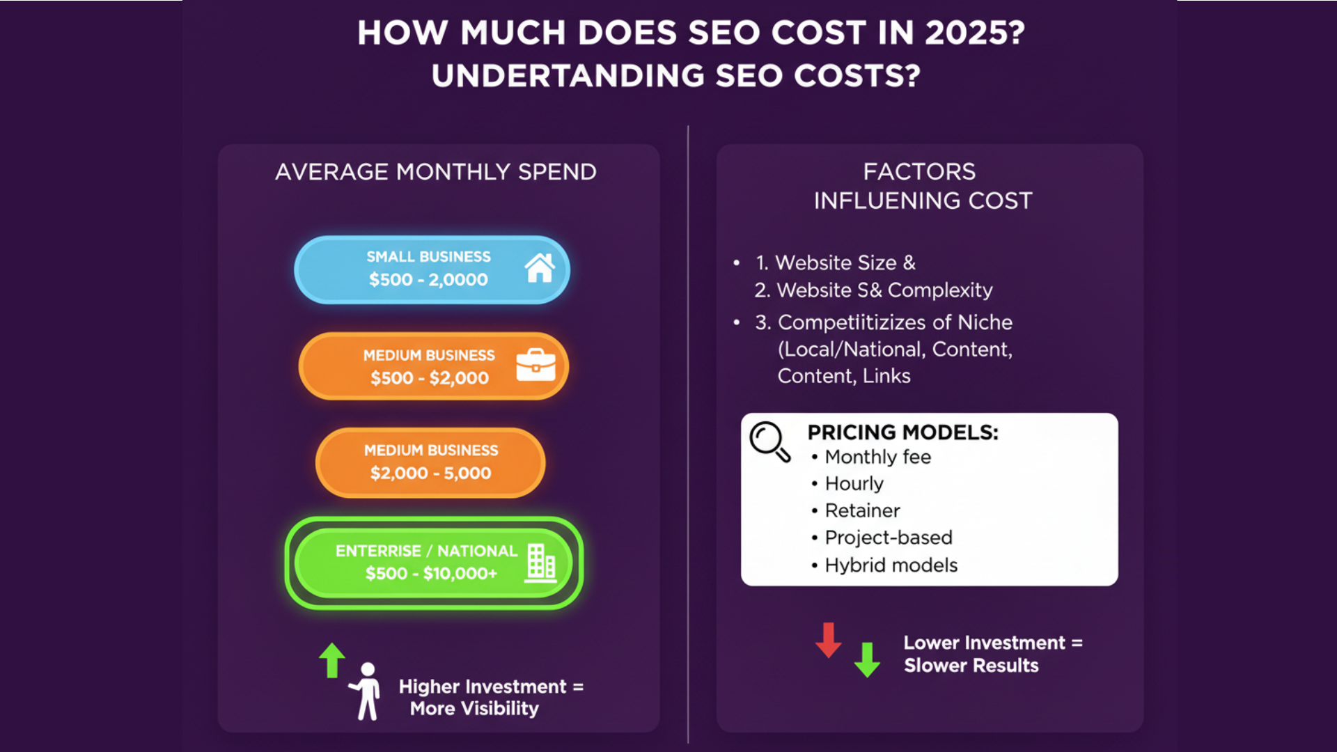 When it comes to SEO pricing, several factors influence how much you'll pay for SEO service. Understanding these variables helps you determine how much SEO will cost for your specific situation and why different businesses pay wildly different amounts.
